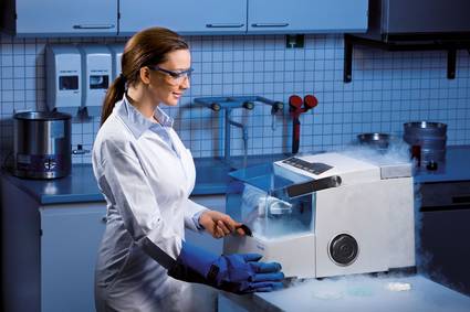 Le CryoMill est utilisé pour le cryobroyage d’échantillons. Grâce au système de refroidissement intégré, le bol de broyage est continuellement refroidi à l’azote liquide avant et pendant le broyage. L’échantillon est fragilisé et les composants volatiles sont conservés.