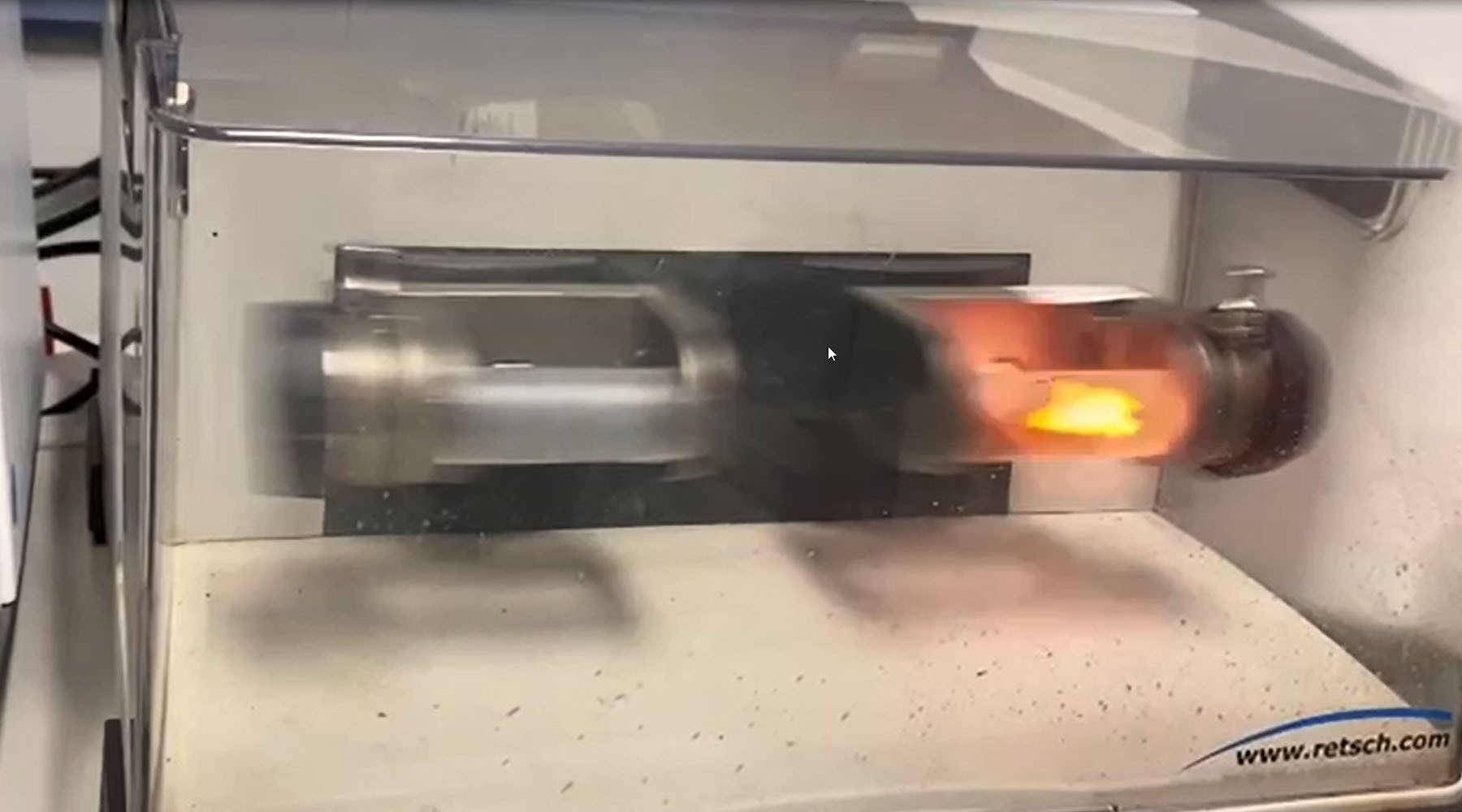 Les vibro-broyeurs sur les broyeurs à billes planétaires ne sont pas garantis, de sorte que de nouveaux essais sont nécessaires. Pour des échelles plus élevées, RETSCH propose les broyeurs à tambour TM 300 et TM 500, qui sont équipés de tambours pouvant atteindre 150 litres. Le principe de fonctionnement des broyeurs à tambour diffère de celui des vibro-broyeurs et des broyeurs à billes planétaires et conduit typiquement à un apport d'énergie plus faible en raison des vitesses de rotation plus faibles. Les premiers essais de mise à l'échelle donnent des résultats prometteurs.