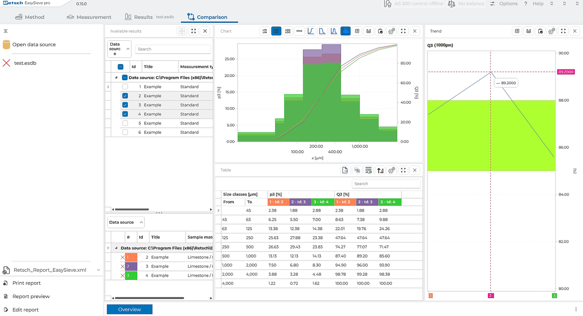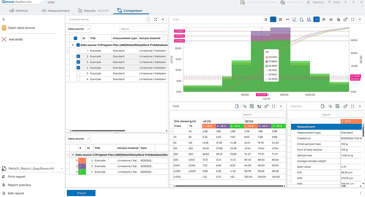 L'analyse des tendances vous permet de garder en permanence un œil sur vos analyses granulométriques. En comparant plusieurs tamisages à l'aide de paramètres librement sélectionnables, vous pouvez identifier les écarts à un stade précoce et garantir le maintien de vos normes de qualité, de manière simple et fiable.