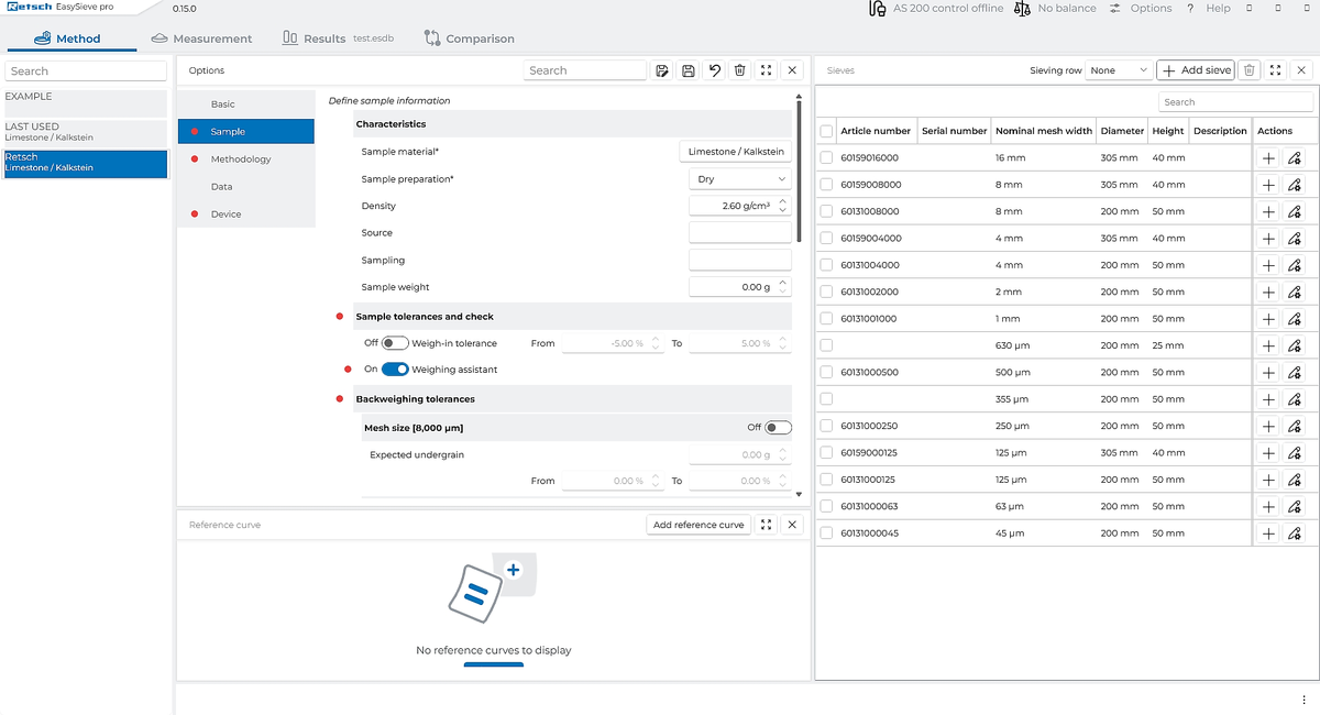 | Connection to sieving machines | Yes, RS232-communication via USB: AS 200 control (USB-A), AS 200 jet (USB-B), AS 200 tap (RS232), AS 300 control (USB-A), AS 400 control (RS232), AS 450 control (RS232) |