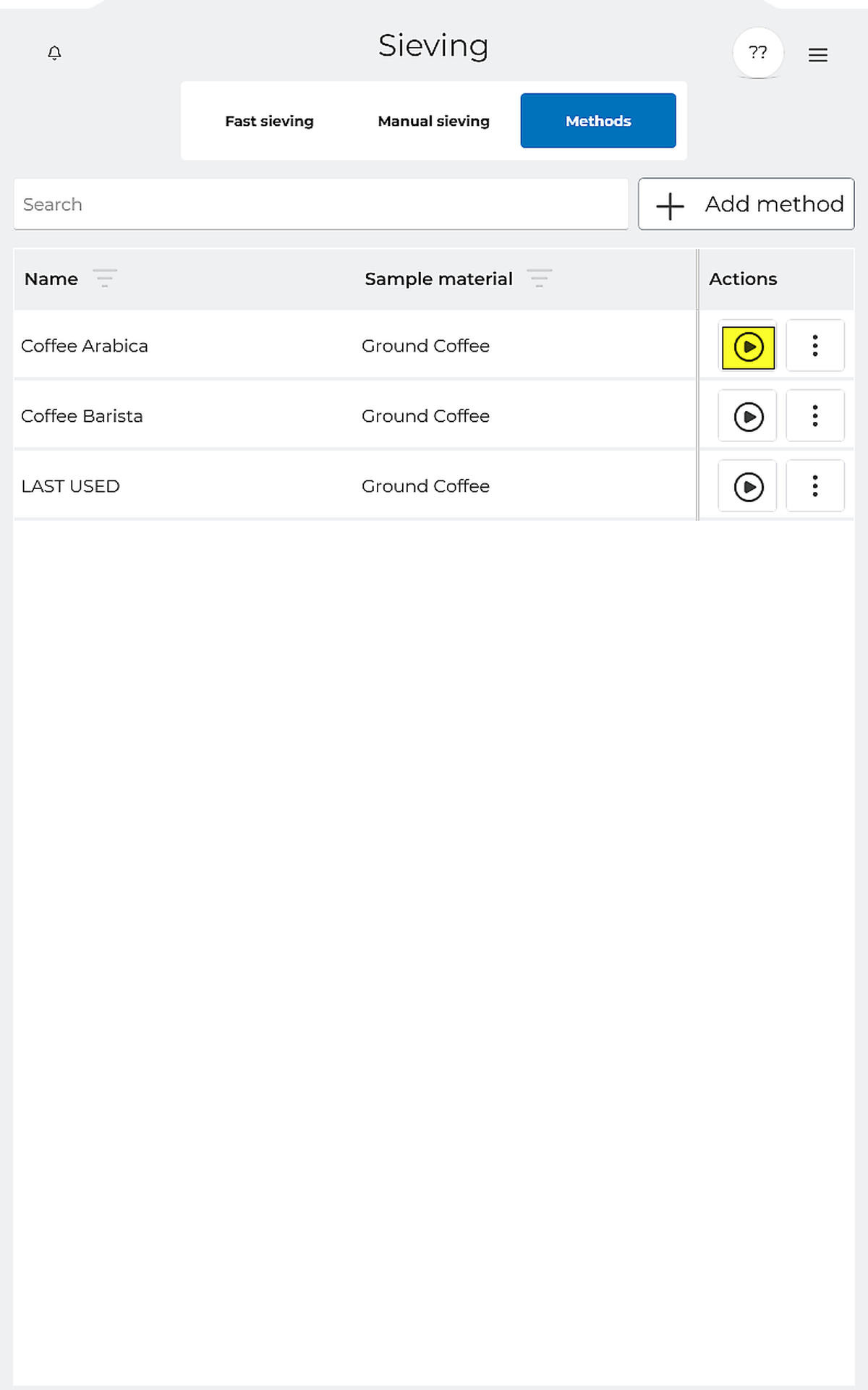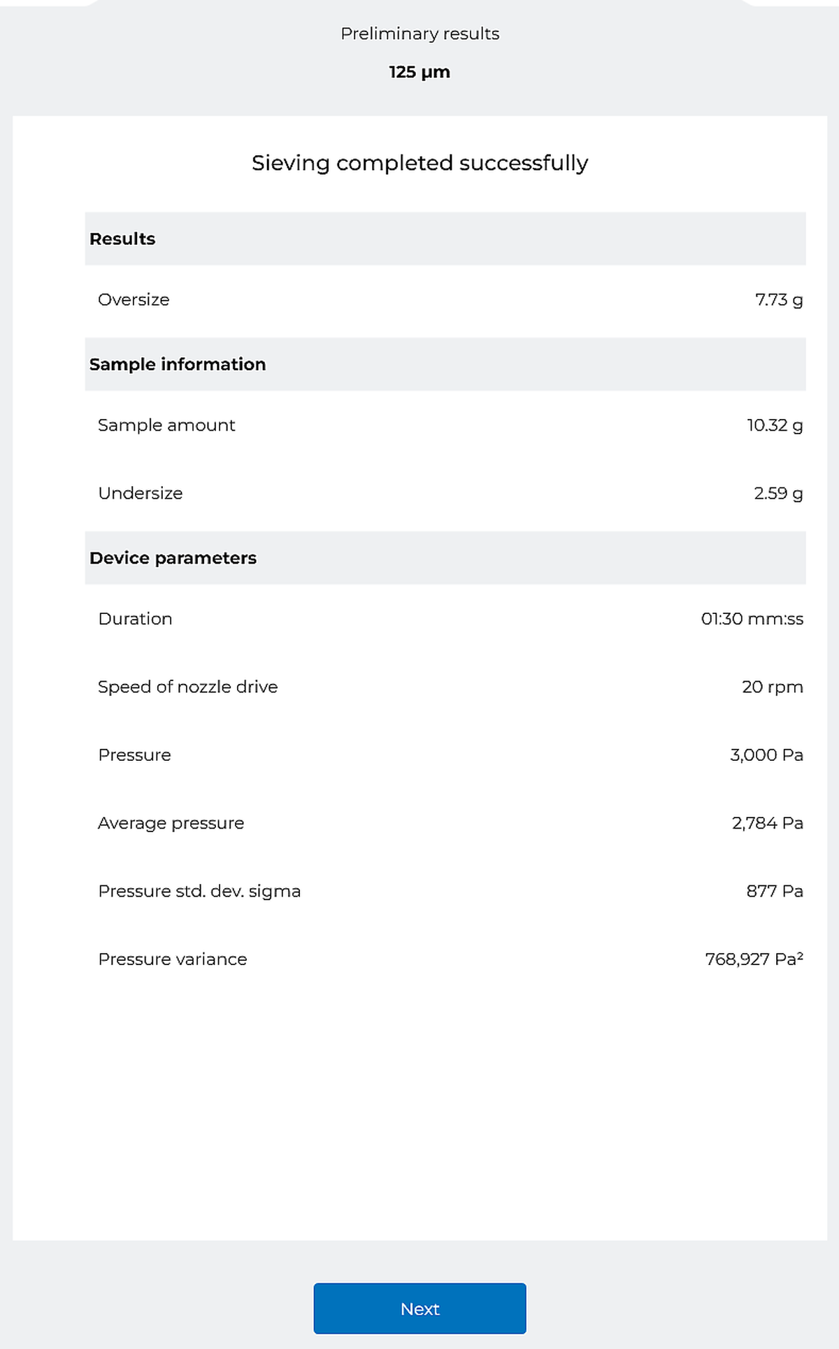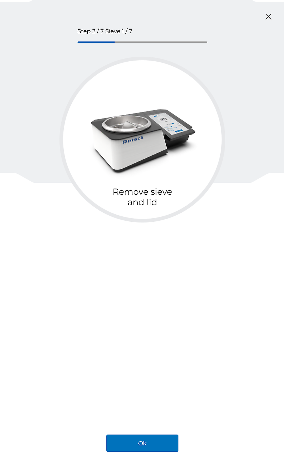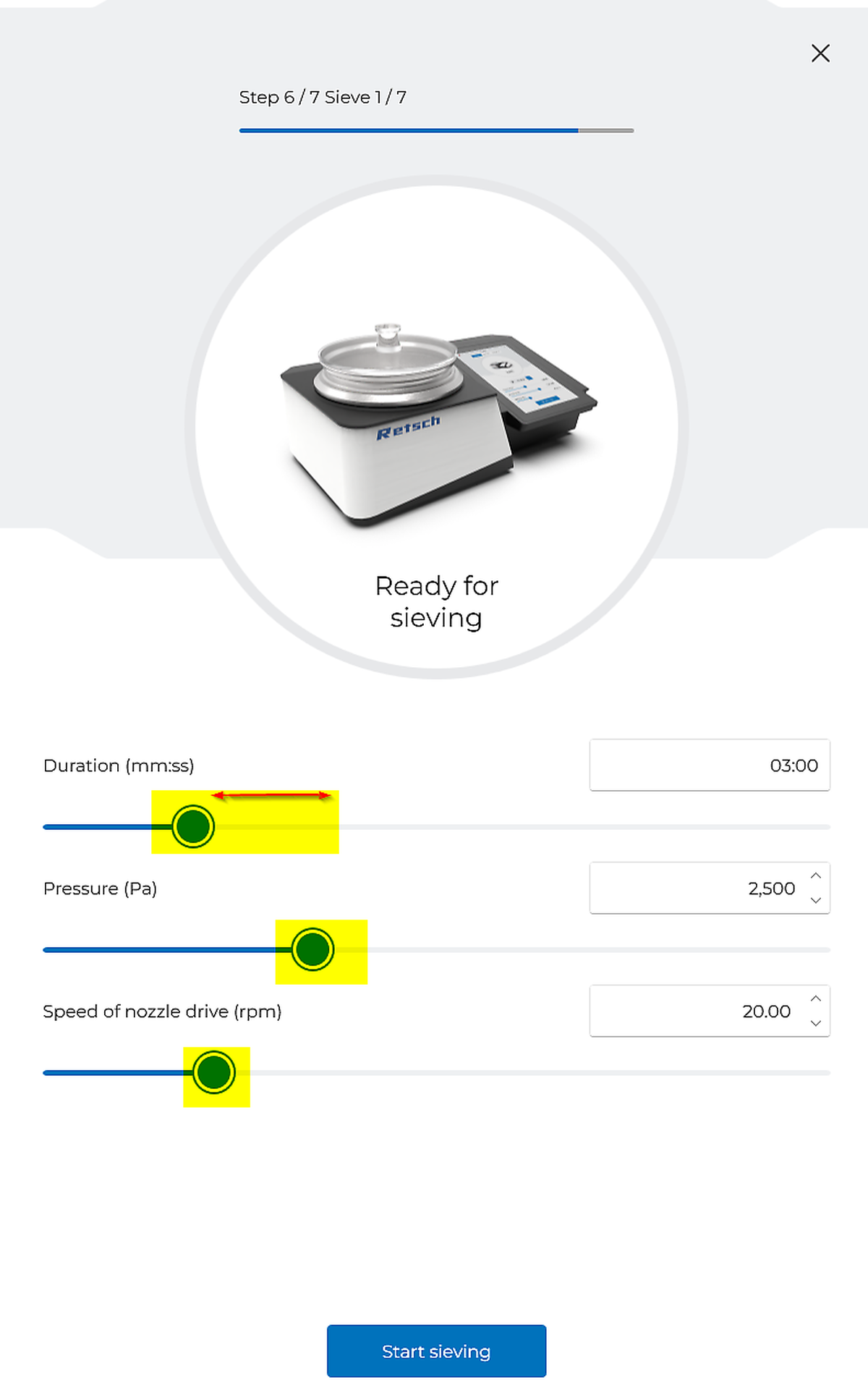 Après avoir sélectionné la méthode de tamisage souhaitée, le logiciel vous guide pas à pas tout au long du processus de tamisage. Vous pouvez contrôler avec précision tous les paramètres pertinents via le panneau de commande de l'AS 200 jet pro. De plus, le tamisage guidé améliore la sécurité, car chaque étape est clairement décrite, ce qui réduit les erreurs humaines.